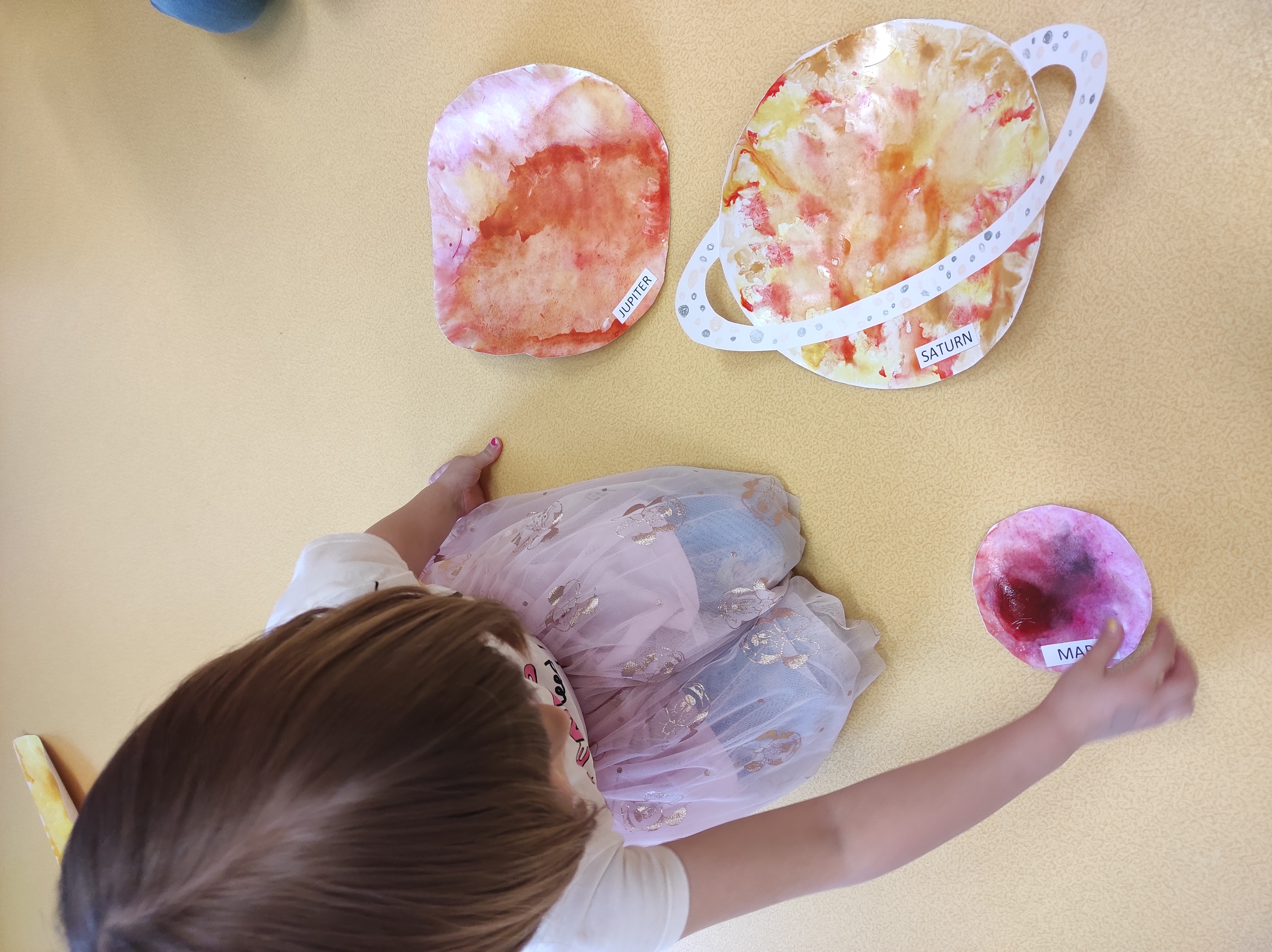 Malba a stříhání- planety+ lepení= planety+ skládání planet z víček+ skládání názvů planet.